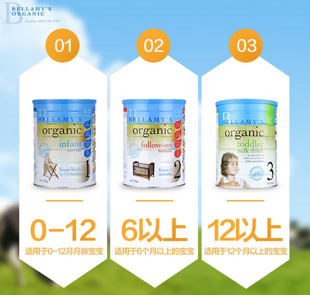贝拉米有机奶粉----澳洲市场上所有婴儿奶粉统一分段,都只分3个阶段,贝拉米奶粉只划分3个阶段,没有欧洲奶粉分段那么详细,但是营养也非常充足。