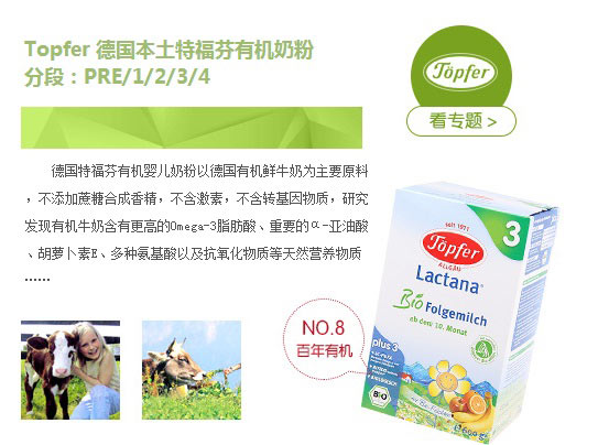 特福芬有机奶粉——德国特福芬公司位于德国阿尔卑斯山脚下,创建于1911年,是德国最早的婴儿食疗产品生产企业。1989年,特福芬公司研制出婴儿有机奶粉凭借近百年的研发和生产经验,如今的特福芬已拥有了有机奶粉、有机婴儿辅食、有机护肤品、有机饮料、保健食品、药品等针对母婴领域的产品系列,是德国母婴领域当之无愧的旗舰。此外,特福芬的优质品质,使其成为欧洲航天宇航员的天空食品指定供应商之一。