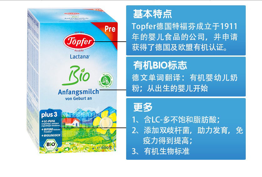 特福芬也是德国著名婴儿食品公司,创建于1911年,品牌历史迄今也百年多了,但是特福芬有机奶粉是1989年研制出的,特福芬有机奶粉是经德国和欧盟有机认证的有机奶粉,和德国喜宝奶粉有机认证标准是完全一致的,都是非常严格的。
