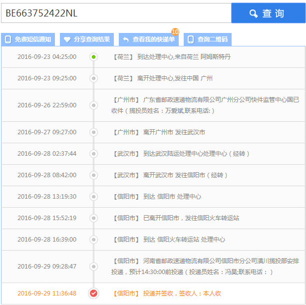 (荷兰TNT物流时效大家感受下)9.22下单的,应该是当天发出的,发货时效方面还是非常不错的,9.23物流显示荷兰 阿姆斯特丹发往中国广州,26号就到达广州海关了,9.29号完美收货,发的荷兰邮政TNT,国际妈咪海淘直邮奶粉的速度这么快,特别特别惊喜,总体来讲,国际妈咪荷兰海淘直邮牛栏奶粉不仅下单简单,重要的是时效非常快,而且物流用的和朋友代购直邮来的一样,是正规国际物流,而非其他海淘网站另外找的转运公司。感觉非常靠谱,以后宝宝的奶粉就国际妈咪荷兰直邮了。