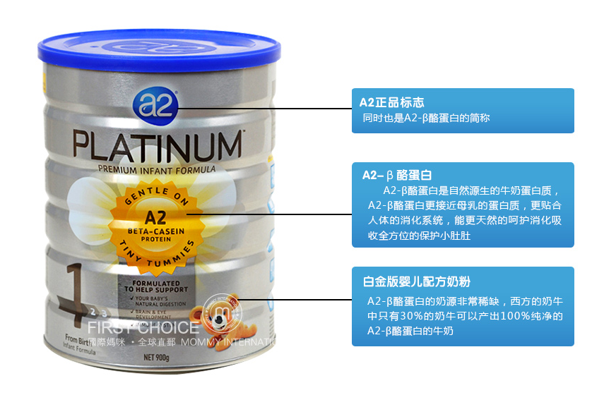 a2 Platinum™白金配方使用全球独创的A2源乳,奶源来自珍稀的A2奶牛,只含100%纯净A2 β-酪蛋白,不含A1 β-酪蛋白,是自然源生的贴近母乳中天然酪蛋白的配方。实验证明A2 β-酪蛋白有潜力改善宝宝的消化功能,促进宝宝对营养物质的吸收,呵护宝宝稚嫩的消化系统; 含有A2 β-酪蛋白的配方,从源头上最大程度地避免了(由A1酪蛋白引起的)不良的健康反应。这个观点已得到全球100多项科学论文的支持和认同。天然、均衡的配方设计,有利于婴幼儿的长远健康, 让宝宝更自然健康地成长。