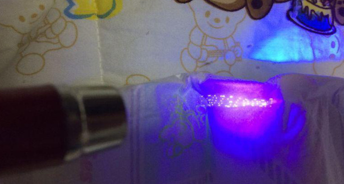 用验钞灯检测纸尿裤尿片上的编码,和上面方法一样,准备一个验钞灯,在比较暗的环境中照射尿片,也会出现一组数字或者字母数字组合,上面提到过了这是花王集团独有生产专利技术,其他仿品目前还做不出,不过生产流水线会有误差,可能有的会没有。