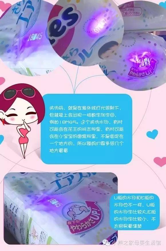 【简单花王验证方法】1、准备一个验钞灯,也就是俗话说的紫外线灯,或者验钞笔,只有紫外线灯才能看到编码。2、每个花王纸尿裤的魔术贴上,有很多小兔子的图案,正品花王的小兔子是可以重合的。大家可以比对。 3、每一个花王纸尿裤都有自己的独立编码。也就是说,您用的任何一个尿片,都是这世界独一无二的。下面详细说明: