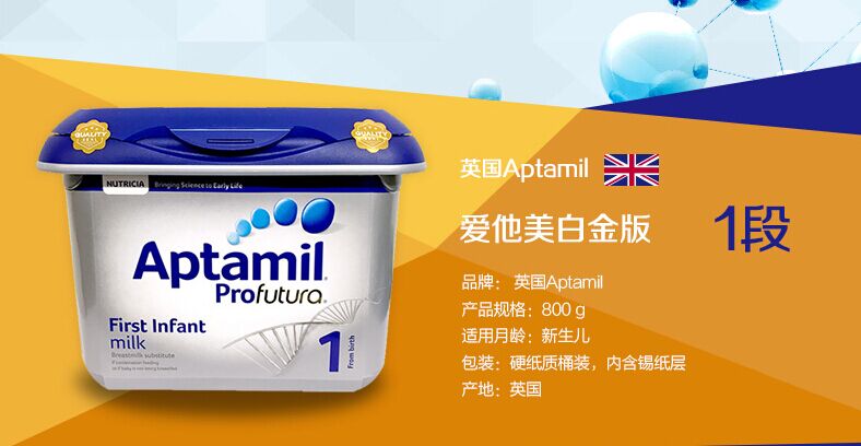 之前普通蓝版英国爱他美奶粉是蓝色背景设计,白金版爱他美奶粉标注为profutura配方是白金配色,有那么一点土豪金的味道。其次经典的萌萌哒小熊不见了,变为DNA似螺旋结构,视觉上更具科学感,看起来更加高端。