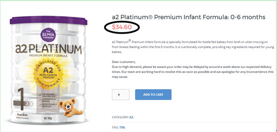A2奶粉价格高昂:(上图来自a2奶粉澳洲官网价格)目前a2奶粉在澳洲超市34.5澳币一罐,折合成人民币的单价180多,澳洲药店价格更贵,折合人民币200左右,这仅是a2奶粉裸价,用户在国际妈咪下单澳洲a2奶粉,发澳洲PCA正规国际物流,一箱6罐运费300元,折合到每一罐a2奶粉上就要230元左右,澳洲的人工成本极高,澳洲人平均年薪在45w人民币,人工费可想而知,那么加上包装费、人工成本。国际妈咪澳洲a2奶粉直邮平均售价在250-300元左右每罐,其他海运渠道会更便宜一点,但是网上一些平台价格比澳洲超市或者a2官网还便宜的话就需要妈妈们自己判断了。
