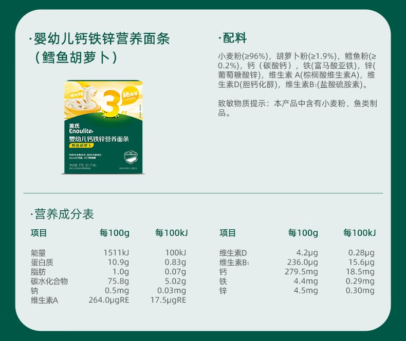 【96任选4件】Engnice 英氏婴幼儿鳕鱼胡萝卜营养面条 175g