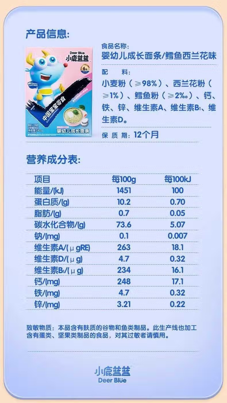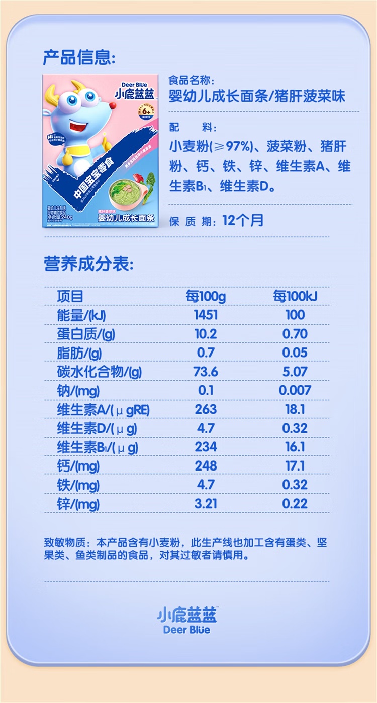 Deer Blue 小鹿蓝蓝婴幼儿加锌成长面条 225g 猪肝菠菜味