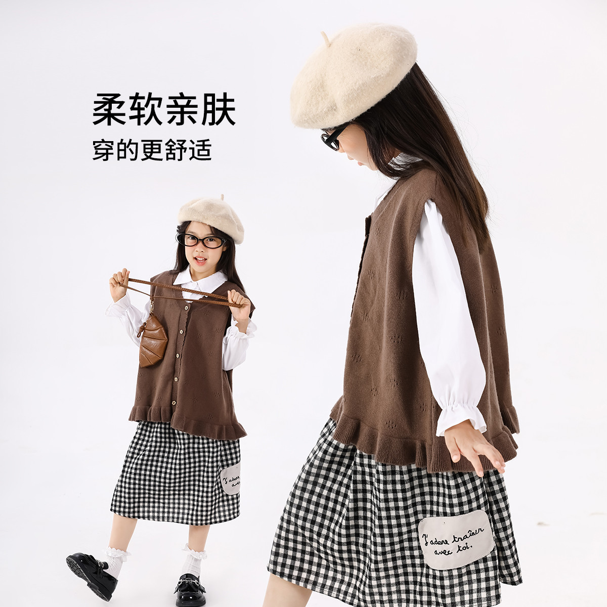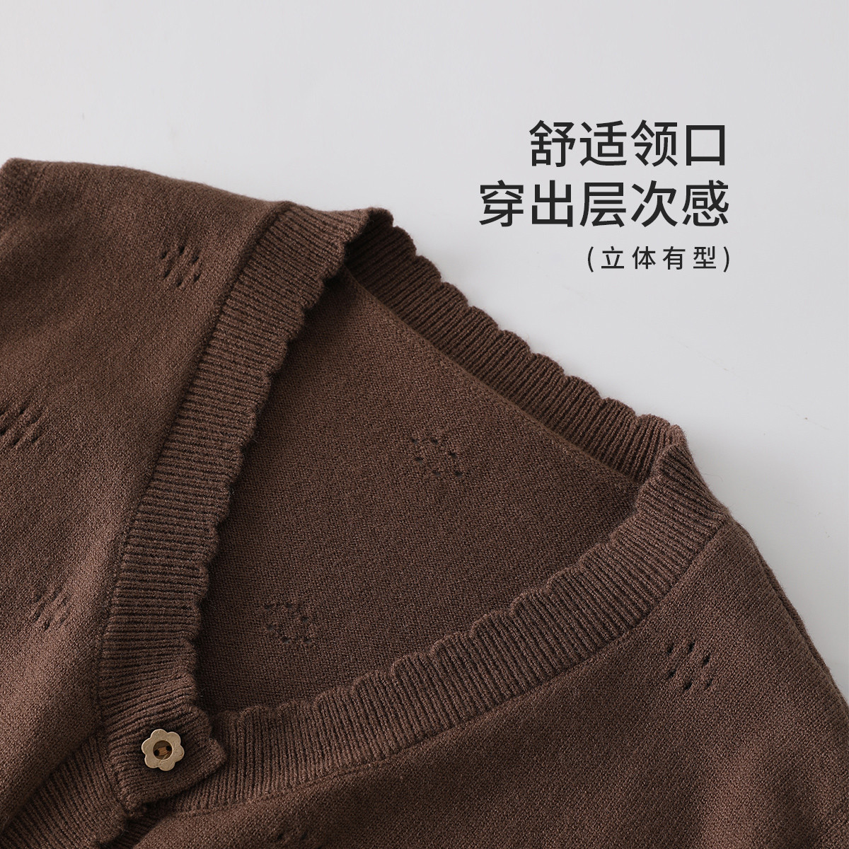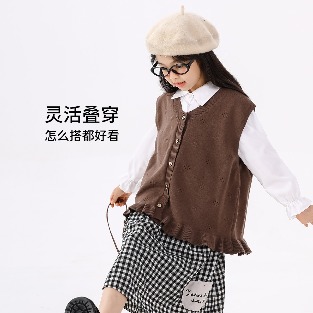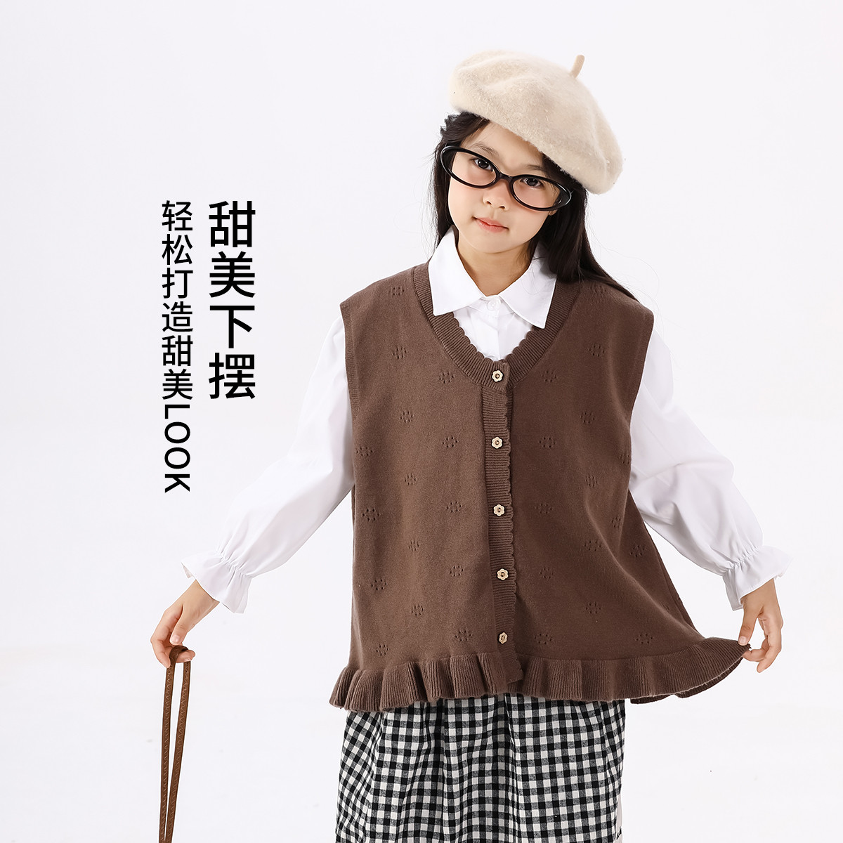 SHINING ELEPHANT 绚象儿童咖色木耳边针织马甲