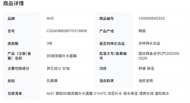 AHC 韩国AHCB5玻尿酸深度补水面膜 5片 海外本土原版