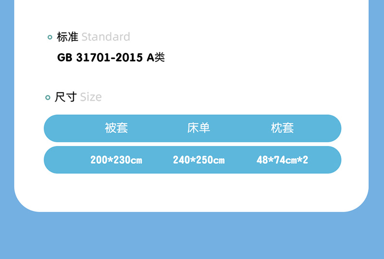| 产品尺寸: | 被套:200*230cm 床单: 240*250cm 枕套:48*74cm*2 |