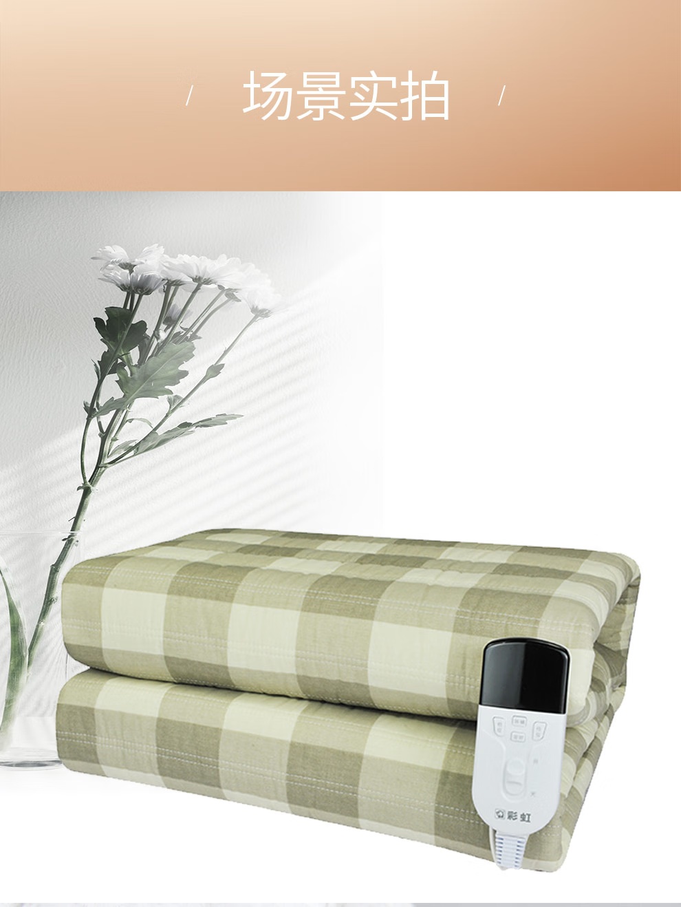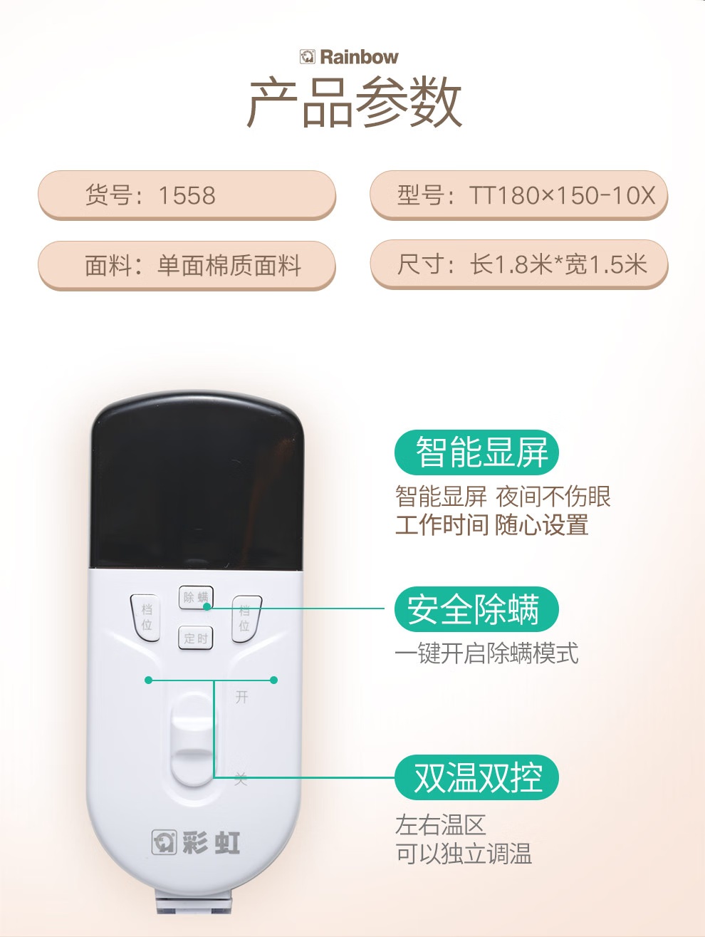 RAINBOW 彩虹双控双温定时除螨纯棉双人电热毯 花色随机 180*150cm