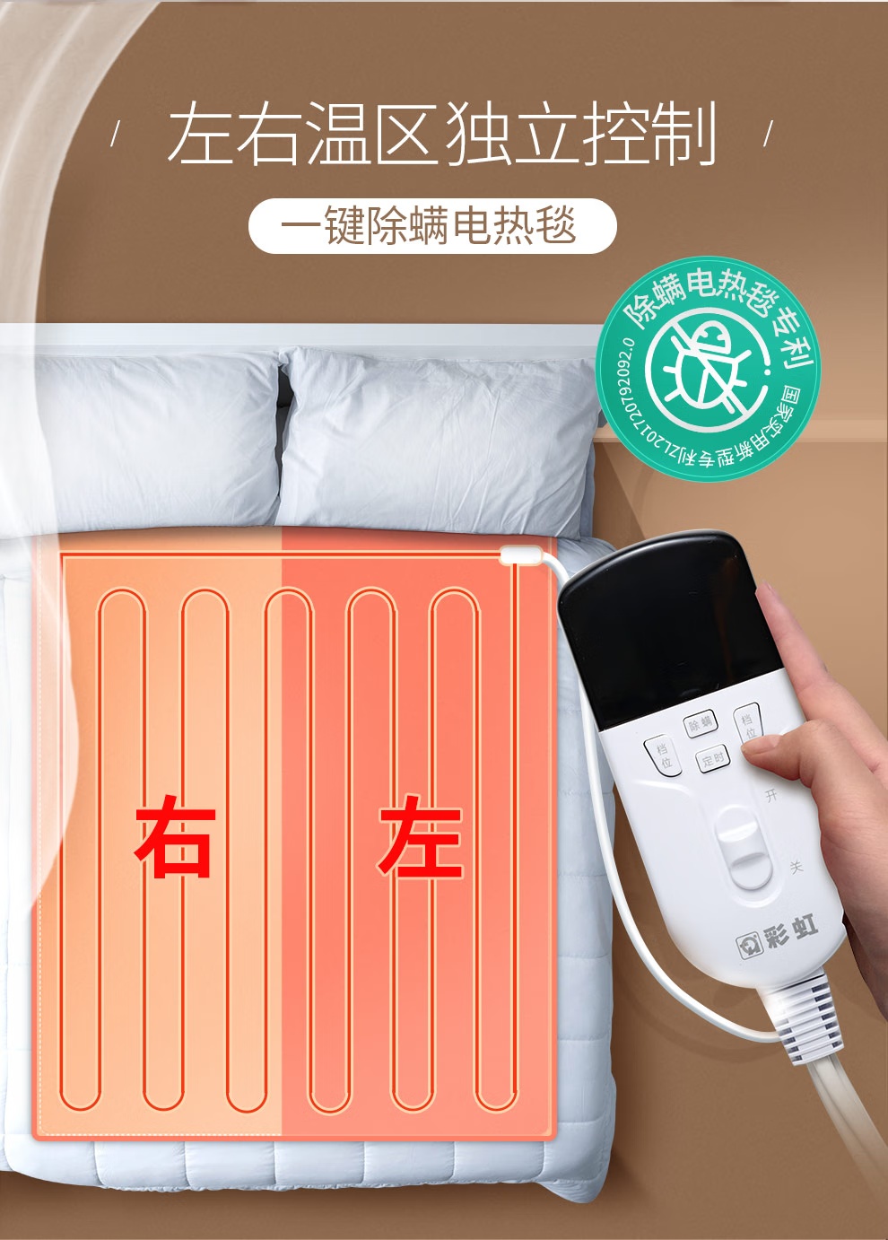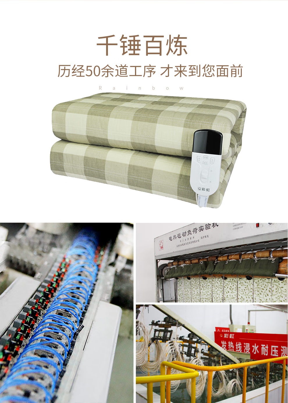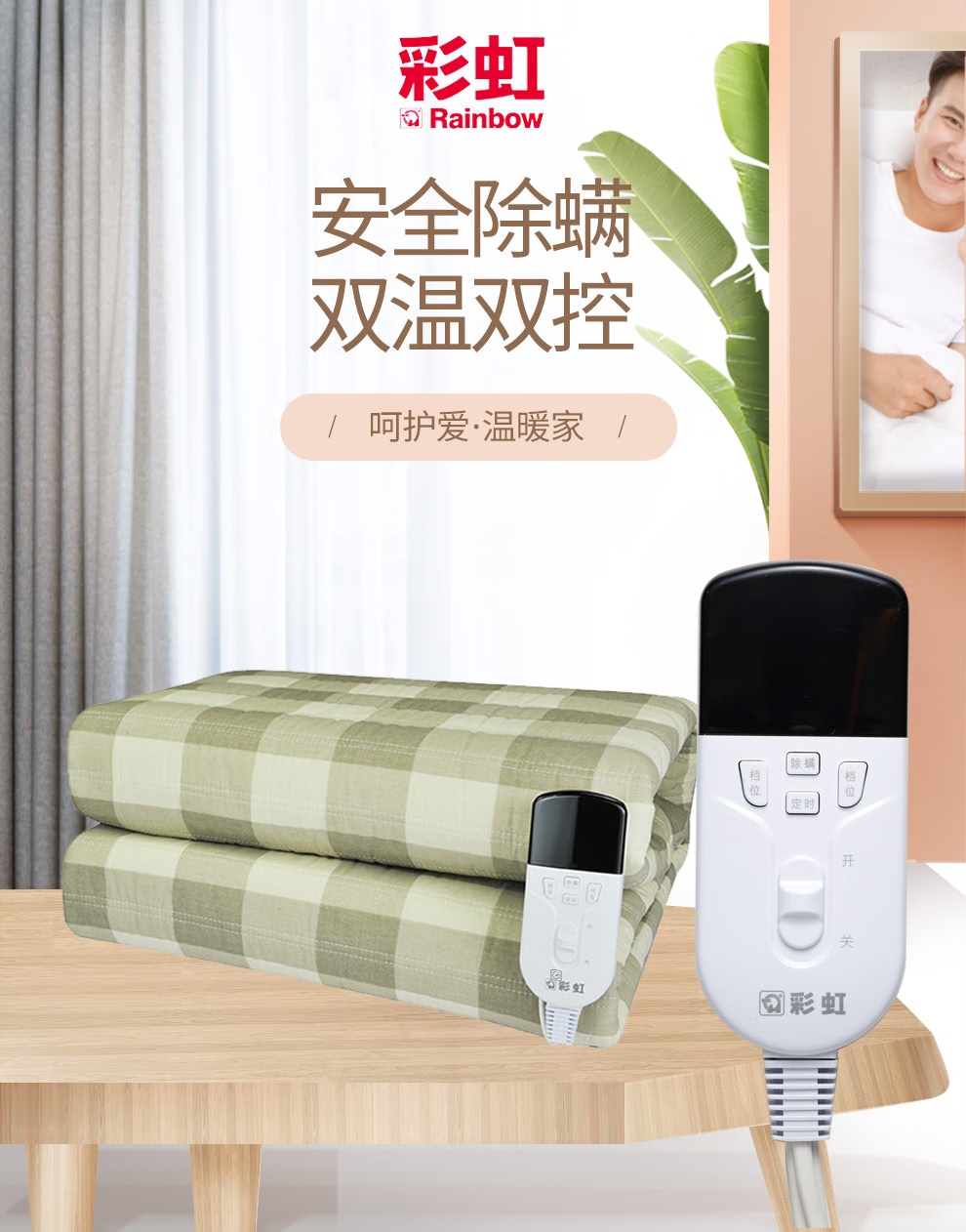 RAINBOW 彩虹双控双温定时除螨纯棉双人电热毯 花色随机 200*180cm