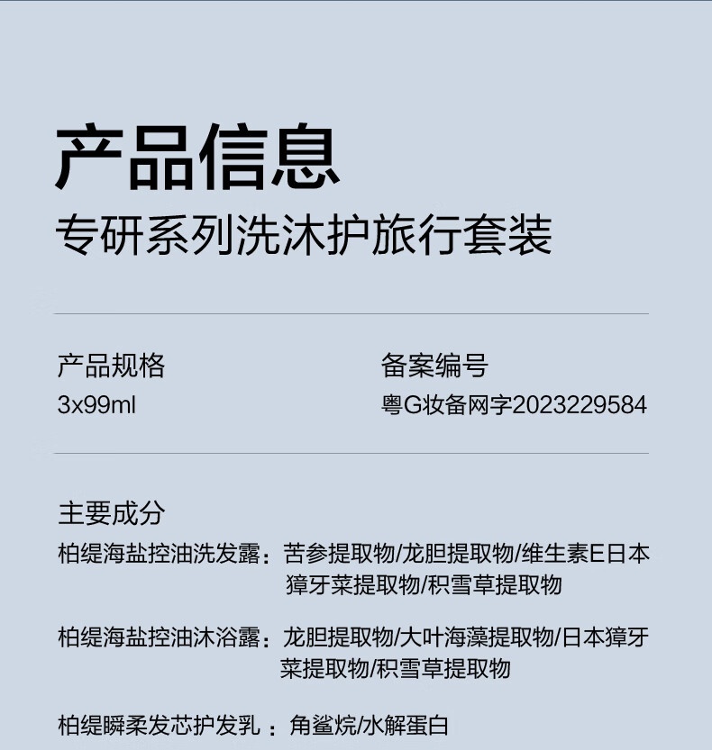| 规格: | 洗发水99ml+沐浴露99ml+护发素99ml |
