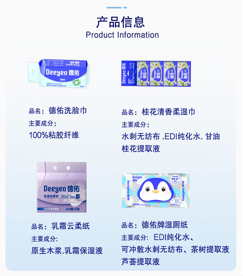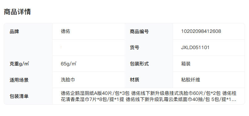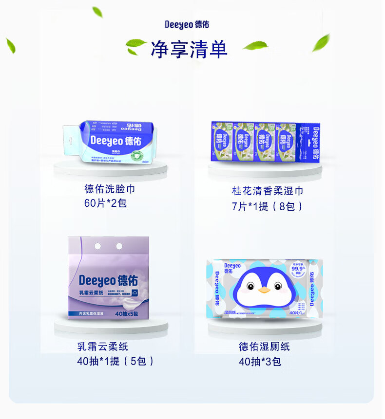 | 规格: | 德佑企鹅湿厕纸A版40片3包 德佑新升级悬挂式洗脸巾60片2包 德佑桂花清香柔湿巾7片*8包/提 德佑新升级乳霜云柔纸面巾40抽5包 |