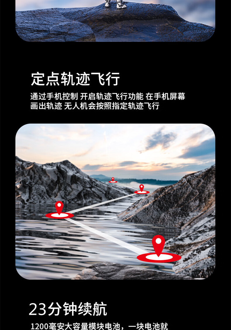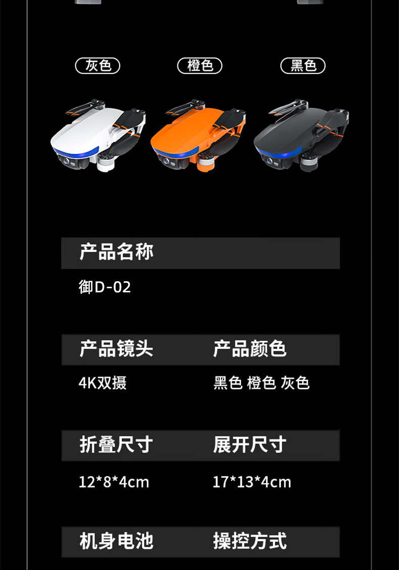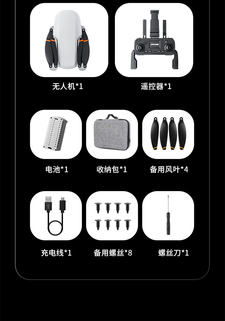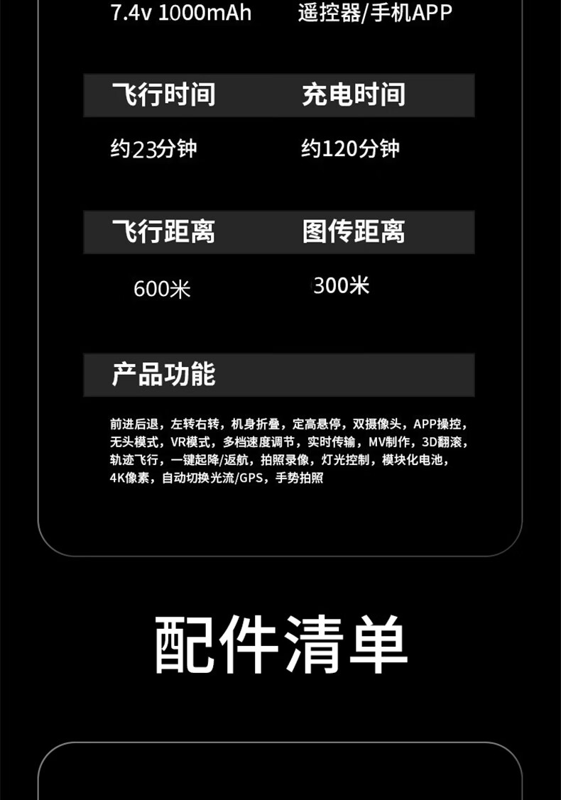 | 配置: | "压力传感器:高度设定 无刷电机:1503 电机功率:2200KV 电调:10A 接收方式:2.4G 电动调节可转角摄像头:通过发射器可调节摄像头,90° 智能锂电池容量:7.4V 900mAh 遥控器手机夹尺寸(支持最大手机尺寸):5.5英寸 遥控距离(无干扰、无遮挡) :500米 飞行时间:22分钟 充电时间:2.5小时 充电方式:USB (5V) 机身尺寸/折叠后:展开尺寸:238*265*43mm;折叠尺寸 :112*72*43mm 机身重量:153克 遥控器电池:内置锂电池3.7V 300 |