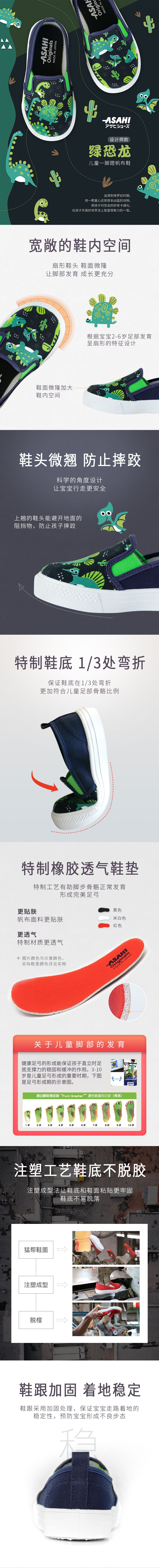 ASAHI 日本朝日儿童一脚蹬绿恐龙帆布鞋