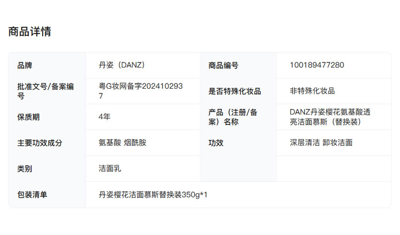 Danz 丹姿樱花氨基酸透亮洁面慕斯袋装补充液 350g