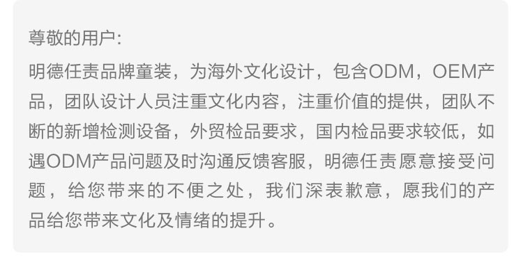 1、划线价、参考价:商品展示的划线价或参考价可能是商品的专柜价、吊牌价或由品牌供应商提供的正品零售价(如厂商指导价、建议零售价等)或该商品在国际妈咪上曾经展示过的销售价,并非原价;由于地区、时间的差异性、商品市场行情的波动以及人民币汇率的变动等因素,品牌专柜标价、商品吊牌价等可能会与您购物时展示的不一致,该价格仅供参考;