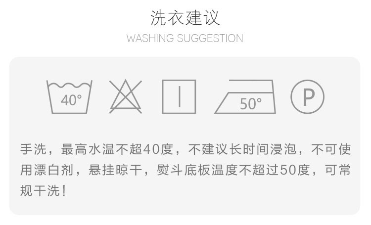 | 注意事项: | 不可使用酸性洗涤剂,不可漂白 |