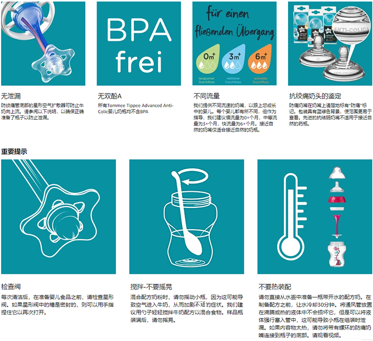 Features 产品特点 1、奶嘴的独特设计能让宝宝体会妈妈乳房般的自然曲线和运动,让宝宝可以随意及舒适地在任何角度吸啜奶嘴。 2、特别升级版排气及防胀气而设计的高敏感度阀门,可保持奶水流量稳定,让宝宝吸吮的更顺畅。 3、瓶身设计符合人体工学,令妈妈哺育时拿握姿势更舒适,同时曲线的瓶身设计让瓶内空气流动更加顺畅,更易喂养。 4、奶瓶超宽口径,让妈妈在清洗及倒奶粉时更方便。 5、瓶身采用安全PP材质,韧性强,环保无毒,安全耐用。