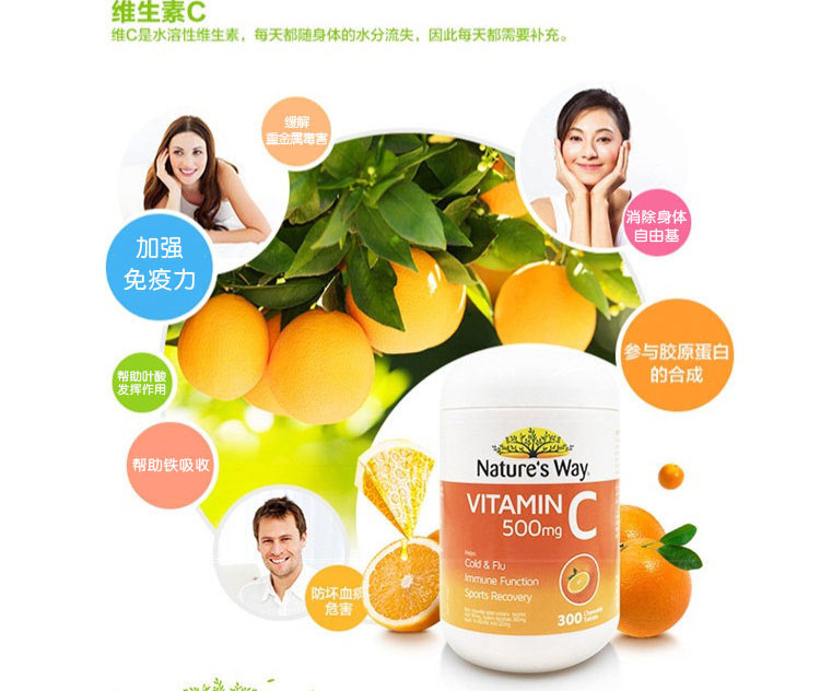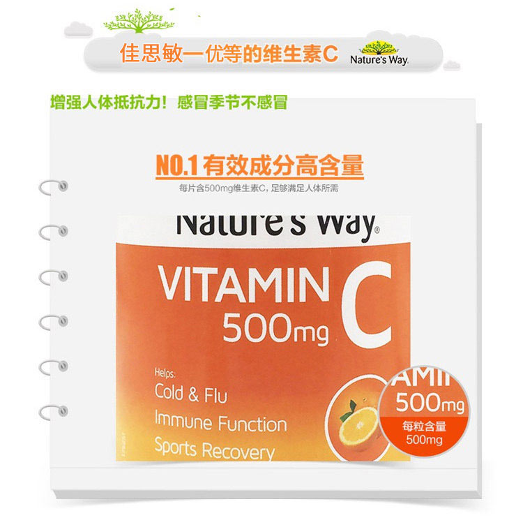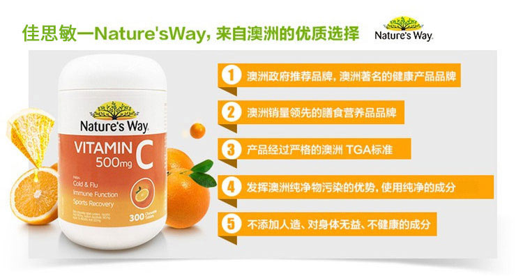 Nature's Way 佳思敏 500mg维生素C片(桔子味)富含维他命C,可帮助预防感冒及流感,减少症状持续时间及症状程度,经常服用维他命C含片还可帮助预防感冒及流感。帮助减轻一些精神压力和焦虑,如果我们体内有足够的维生素C,我们的心理状态会相对稳定,而且抵抗外来压力的能力会大大提高。