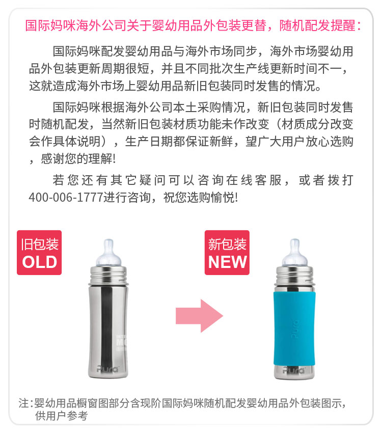 Parameters 产品参数 容量:325ml 适用年龄:3个月以上宝宝 材质:瓶身:不锈钢 奶嘴:安全硅胶 清洗方式: 1、首次使用前,应沸水消毒5分钟,以确保卫生。 2、先用奶瓶清洗剂清洗干净,奶瓶、奶嘴和配件均可用消毒锅消毒,也可以煮沸消毒,消毒时间3-5分钟。 注意事项: 1、不要长时间让宝宝含着奶嘴。 2、不要让宝宝走路时拿着奶瓶玩耍。 3、定期检查奶嘴和配件,如果发现损坏,请立刻丢弃并换上好的奶嘴或者更换奶甁。 4、消毒前,请拆散奶甁各个部件。 5、不要把安装好的奶瓶放在微波炉中。 销售地:America/美国 品牌:Pura kiki/普拉奇奇 |