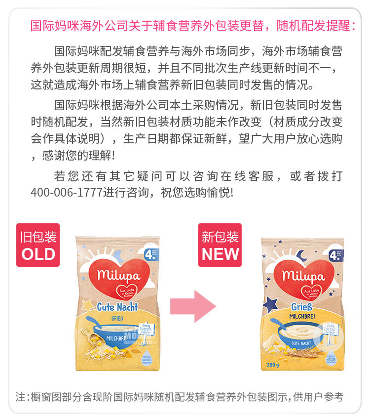 Features 产品特点 1、专为4个月以上的婴幼儿特别研制的美味营养晚安辅食。 2、谷物含有宝贵的碳水化合物,这对于满足宝宝日益增长的能量需求非常重要。 3、食材经过精细研磨,无麸质,口感细腻,适合小宝宝。 4、除了含有高比例的玉米、大米外,还包含牛奶。