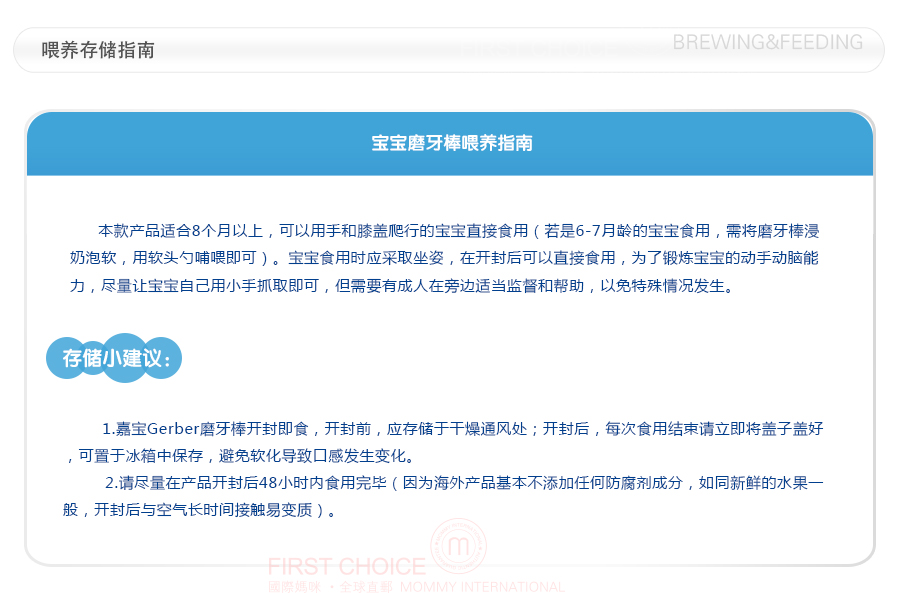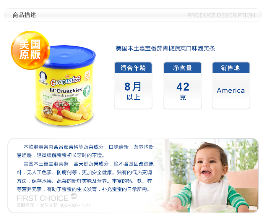 1、划线价、参考价:商品展示的划线价或参考价可能是商品的专柜价、吊牌价或由品牌供应商提供的正品零售价(如厂商指导价、建议零售价等)或该商品在国际妈咪上曾经展示过的销售价,并非原价;由于地区、时间的差异性、商品市场行情的波动以及人民币汇率的变动等因素,品牌专柜标价、商品吊牌价等可能会与您购物时展示的不一致,该价格仅供参考;