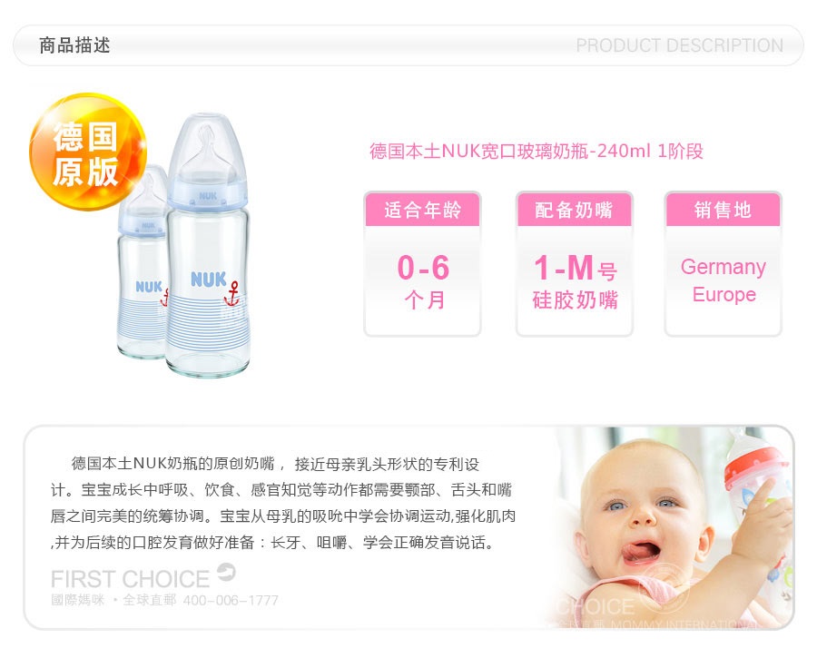 NUK 德国NUK宽口玻璃奶瓶240ml 0-6个月 海外本土原版