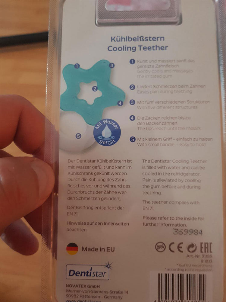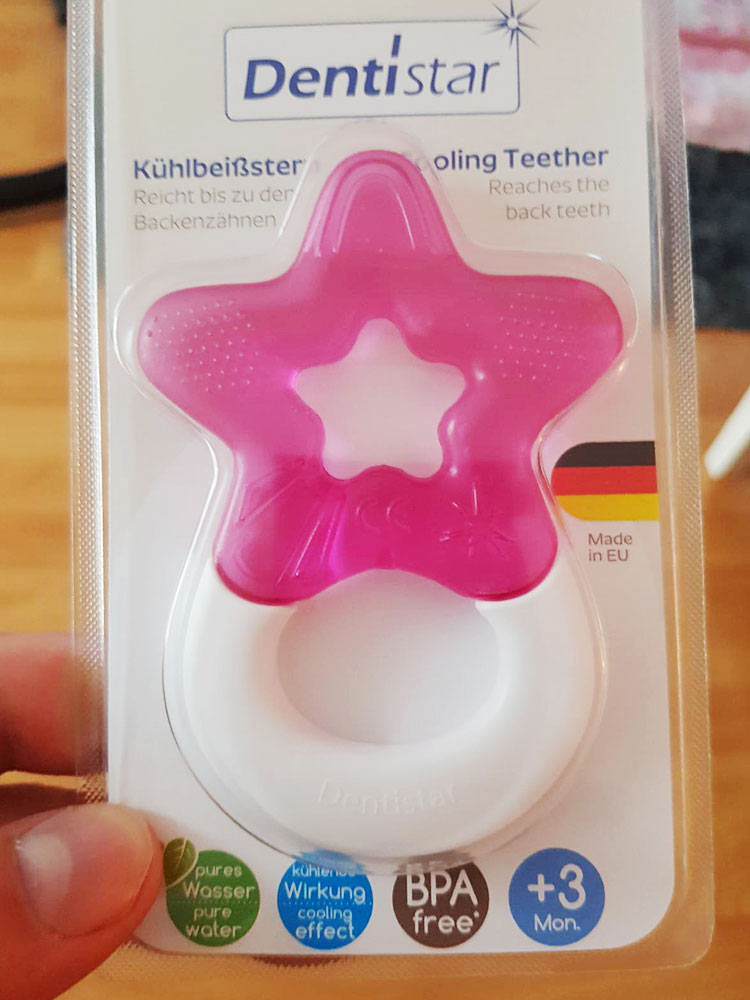 牙胶收到包装材质都特别好,没有味道,放热水里消毒煮沸过也没有味道噢,质量特别好,宝宝迫不及待的吃起来了,干净又方便,信赖国际妈咪,值得购买
