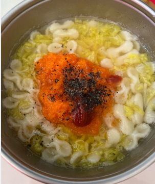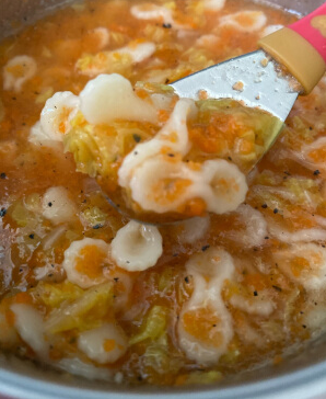 有劲道宝宝能接受那种,放了胡萝卜娃娃菜番茄酱和黑芝麻粉,宝宝都吃光了,蝴蝶弯弯的宝宝觉得很可爱,会拿小手去轻轻捏一捏,一勺一个,宝宝也可以自己吃,也不会噎着