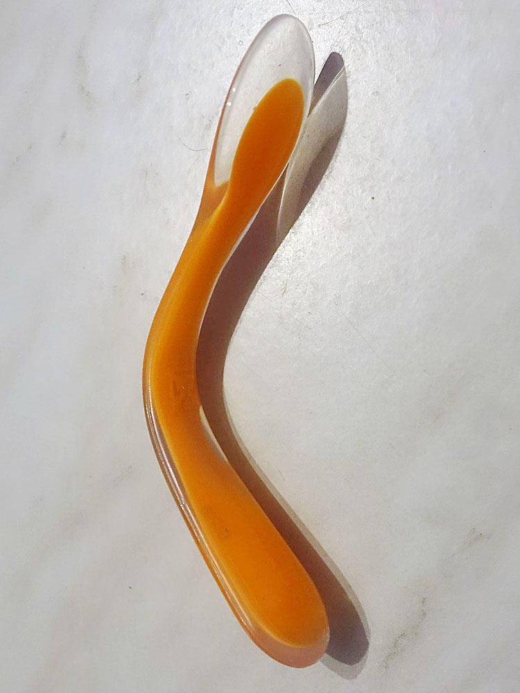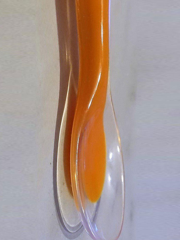 这勺子相当软,都是硅胶的,勺头也是,可随意变软,质量相当不错了,消毒之后给宝宝用上了,用起来也非常方便,大小适合宝宝自己进食,非常好用,颜色也很好看,不错不错,很好的勺子,信赖国际妈咪